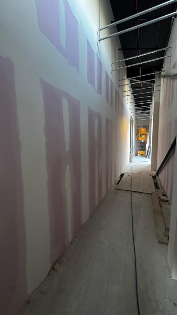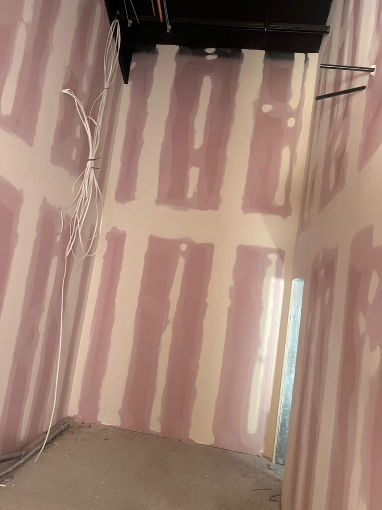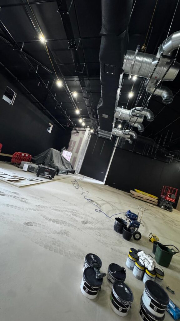 Complete spray finish application to new plasterboard walls and ceiling within a large industrial unit, creating a full blackout finish using specialist airless spray equipment.